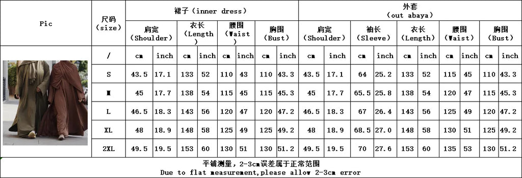 2XL: Outerwear length 155cm, Outerwear waist 137cm, Outerwear bust 132cm, Outerwear shoulder width 50.5cm, Outerwear sleeve length 71cm; inner dress length 155cm, inner dress shoulder width 50.5cm, inner dress bust 132cm, inner dress waist 132cm